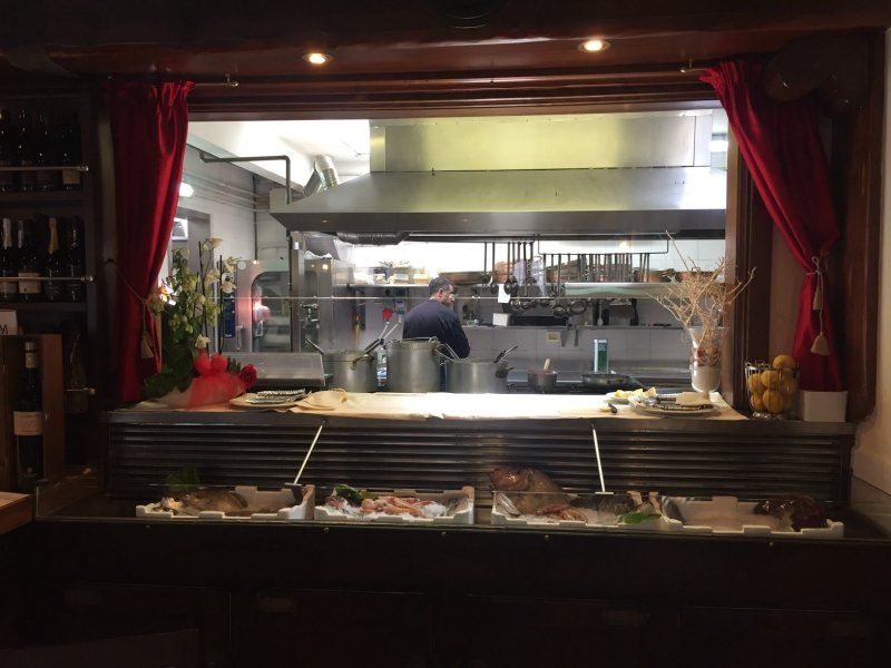 The area is spacious and bright. The open kitchen and fish display mean you can choose your meal and follow the preparation of traditional seafood dishes from Viareggio.
